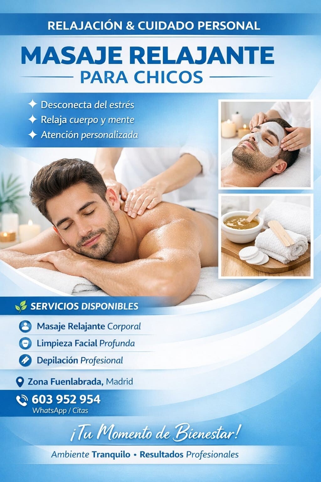 MASAJE LIMPIEZA FACIAL. ÉFOLIANTE DE CUERPO CORPORAL. DEPILACIÓN CORPORAL DE PILACIÓN ÍNTIMA. PENICURA. DOMICILIO. DISCRECIÓN TOTAL EN FUENLABRADA